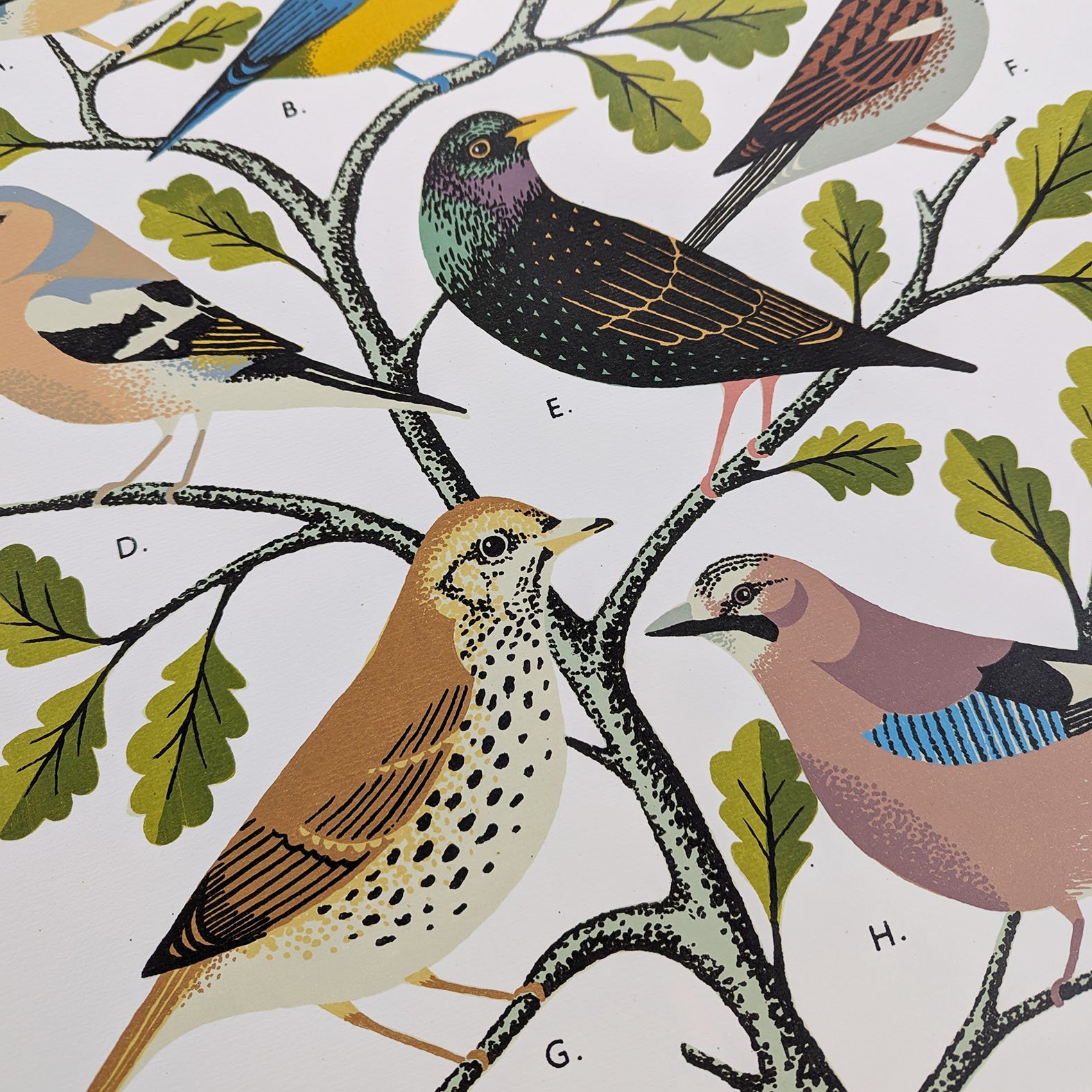 An old style school chart featuring eight different birds. Hand pulled twenty seven colour screen print on Fabriano paper.