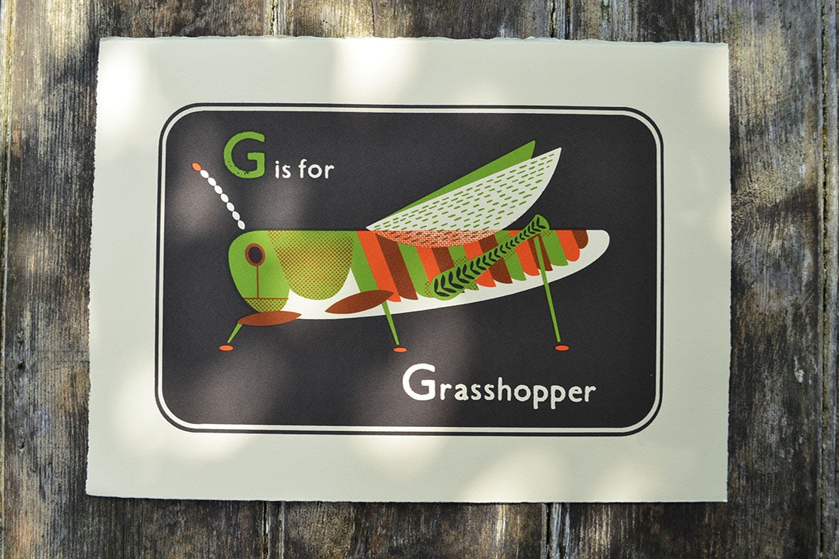 Learn a letter of the alphabet with this school flash card! Hand screen printed on a cream Somerset paper in three sumptuous colours.