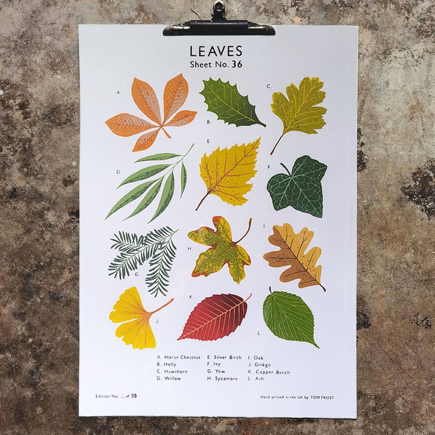 An old style school chart featuring twelve types of leaves. Hand pulled twenty nine colour screen print on Fabriano paper.