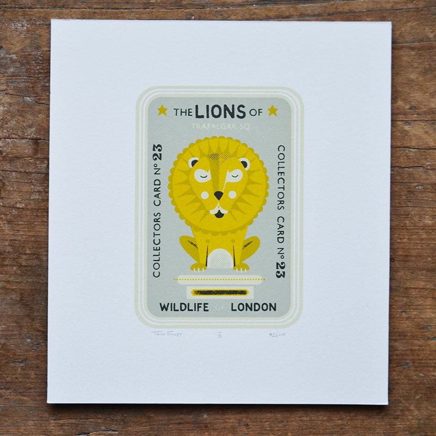 A collectors card showing some famous birds and beasts in and around London. Hand screen printed in four colours on Fabriano paper.