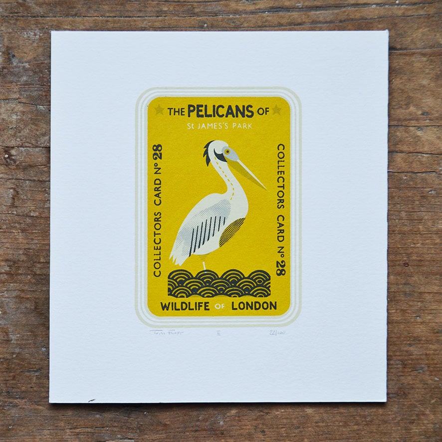 A collectors card showing some famous birds and beasts in and around London. Hand screen printed in four colours on Fabriano paper.