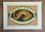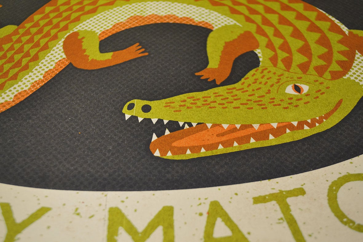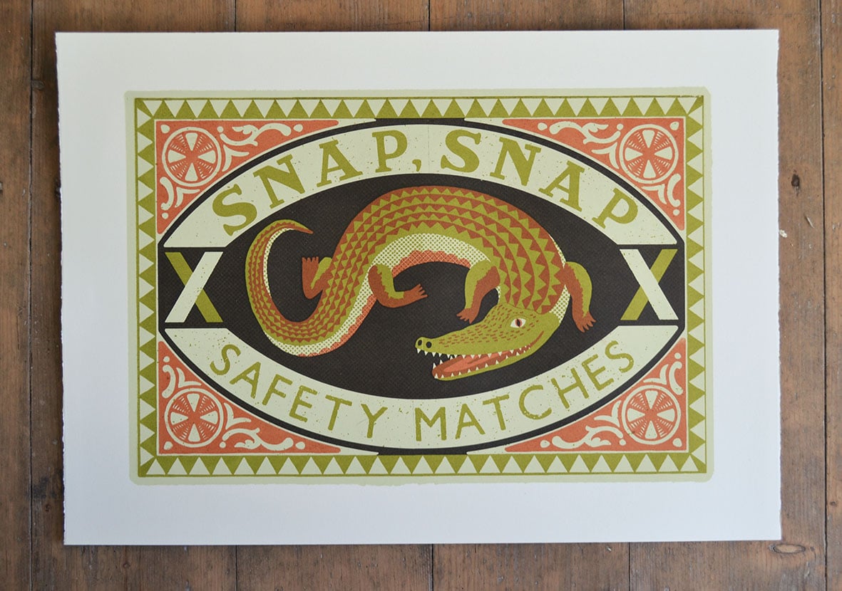 A crocodile on a match box. What more could you want? Keep away from children! Hand pulled four colour screen print on Fabriano paper.