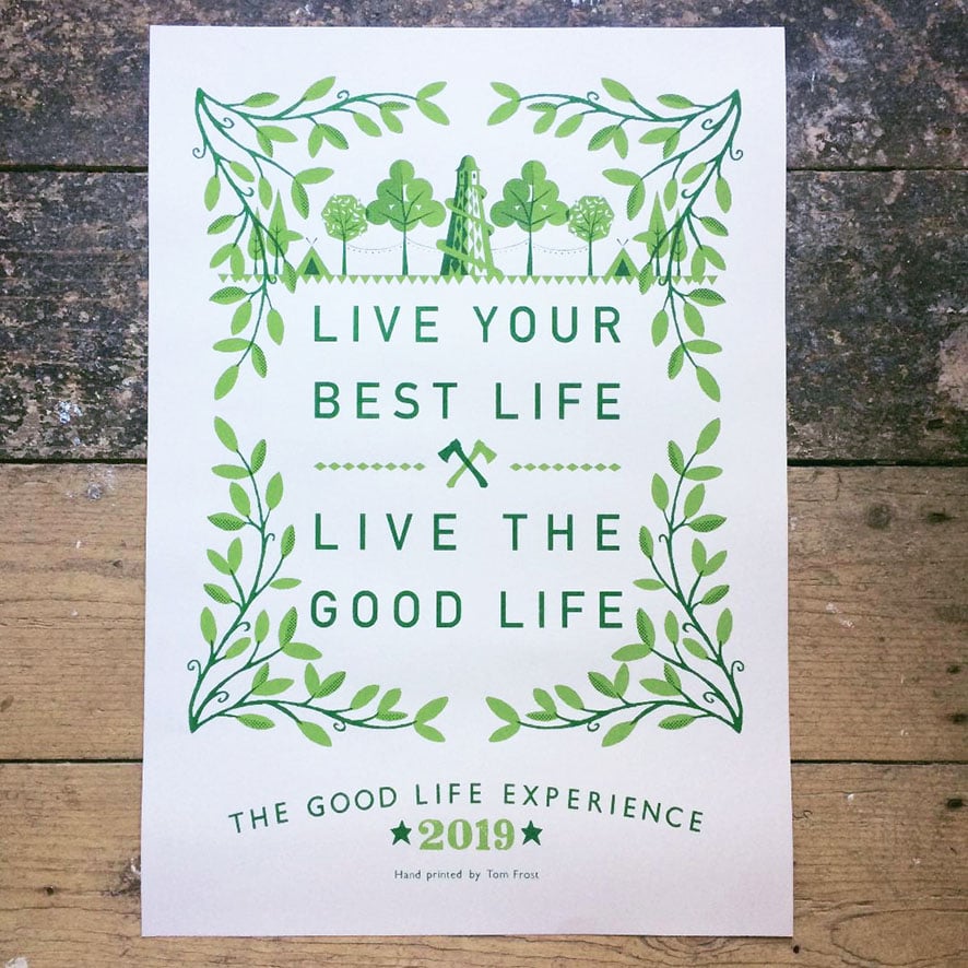Did you get to The Good Life Experience 2019 in Hawarden, Flintshire, North Wales? No. Then why not take home a little slice of the festivities in this easy on the eye A2 festival poster. Available in either green or blue. Hand screen printed (in a field) in two colours.
