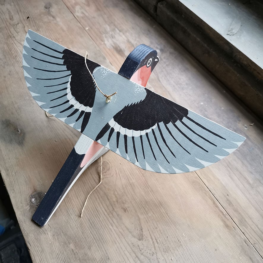 Constructed from plywood, this hand printed bullfinch comes in its own box and fixes together with an eye hook to hang from a place of your choosing.